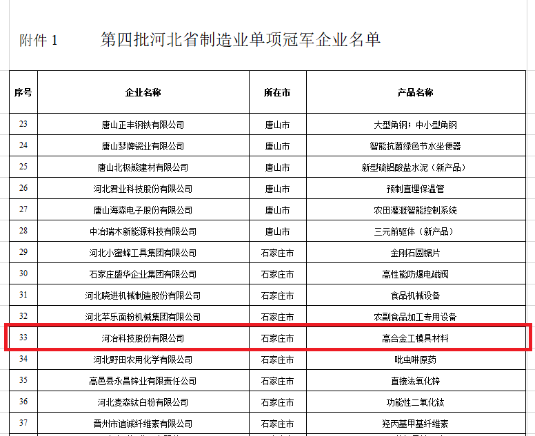 近日,河北省工業(yè)和信息化廳發(fā)布《關于公布第四批河北省制造業(yè)單項冠軍企業(yè)名單的通知 冀制強省辦〔2022〕25號》。經(jīng)企業(yè)申報、各市工信部門推薦、專家評審、現(xiàn)場抽查、公示,確定了河北省第四批制造業(yè)單項冠軍企業(yè)(產(chǎn)品)名單,通過公示期,河冶科技股份有限公司獲得河北省單項冠軍企業(yè)認定。